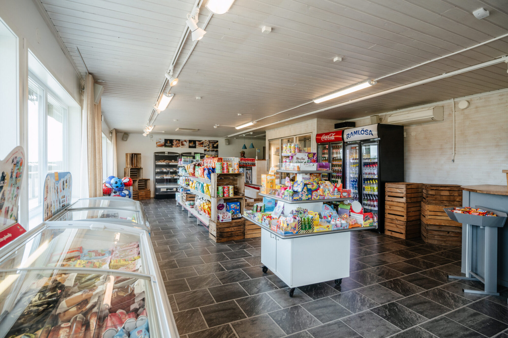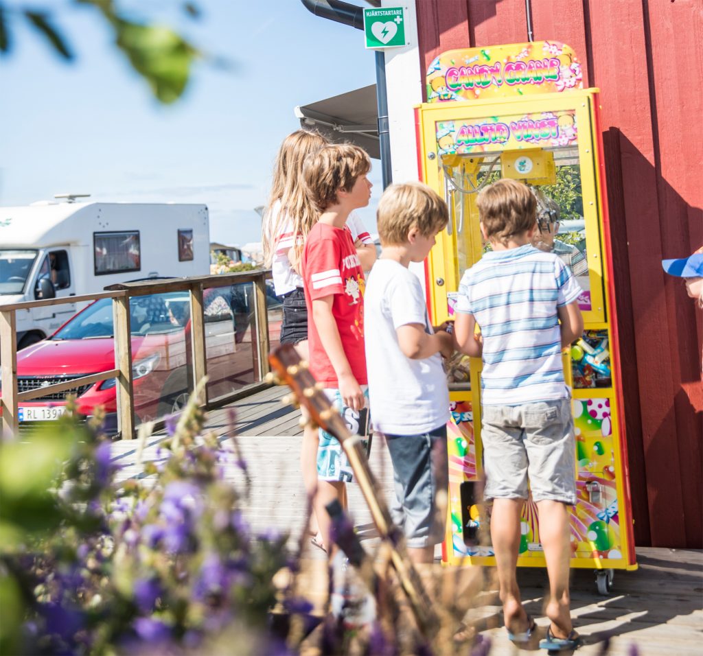 I vår servicebutik hittar ni ett urval av det viktigaste. Under högsäsong finns nybakat bröd, frukt och grönt, frukosttillbehör, mejeriprodukter, hygienartiklar, grilltillbehör, campingtillbehör, leksaker och spel för regniga dagar. Och så klart: chips, godis, dricka och glass och allt annat för Fredagsmyset!