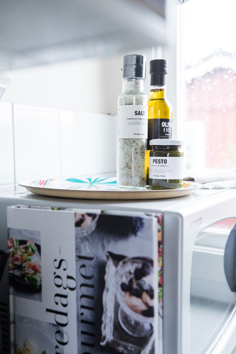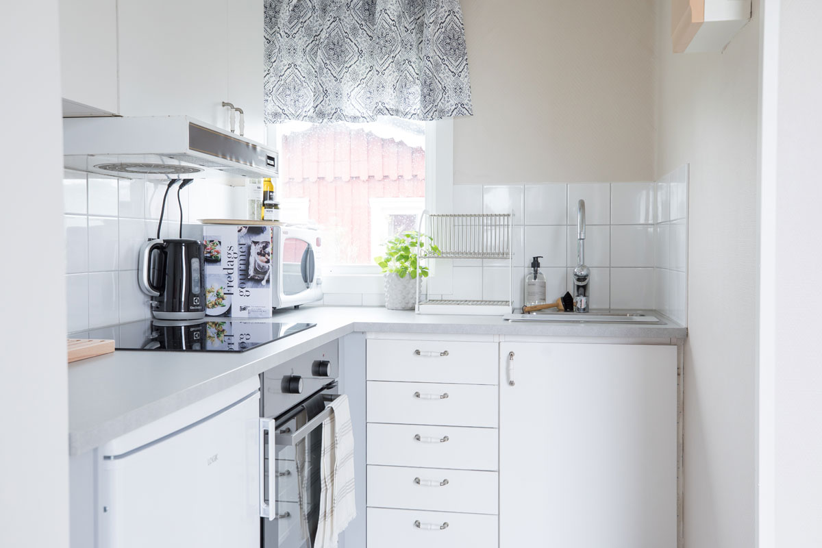 Stekspade, visp, plastslev, konservöppnare, osthyvel, vinöppnare, brödkniv, smörkniv, potatisskalare, sax, grytunderlägg x 2, gratängform, skärbräda, stekpanna, kastrull x 3, salladsskål x 2, bricka, durkslag, brödkorg, litermått, vattenkokare, mikrovågsugn, kaffebryggare, dammsugare, moppstativ och mopp, hink, brandvarnare, TV med tillhörande kontroll.