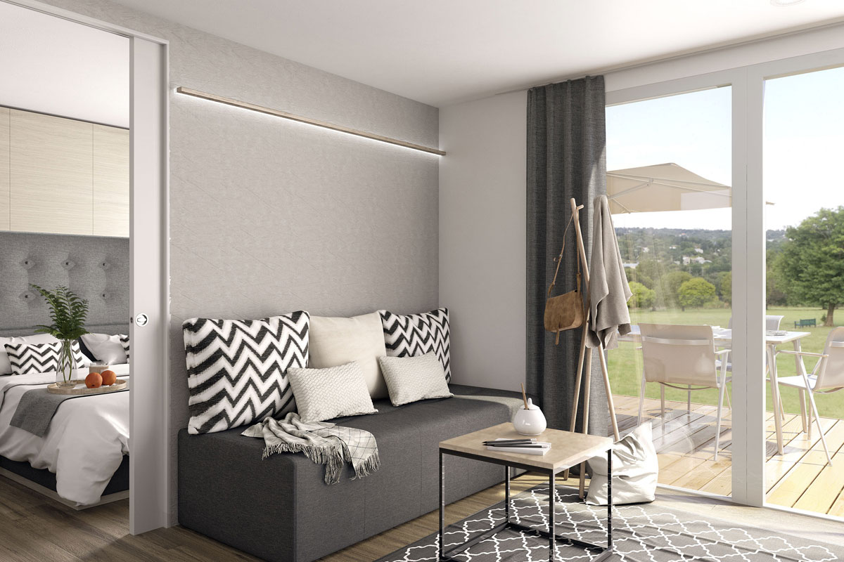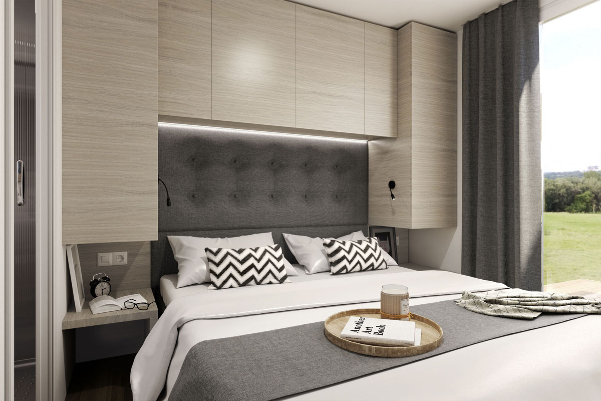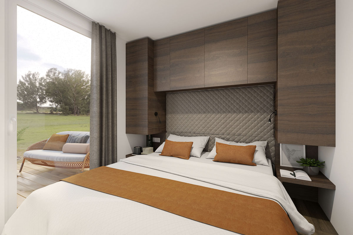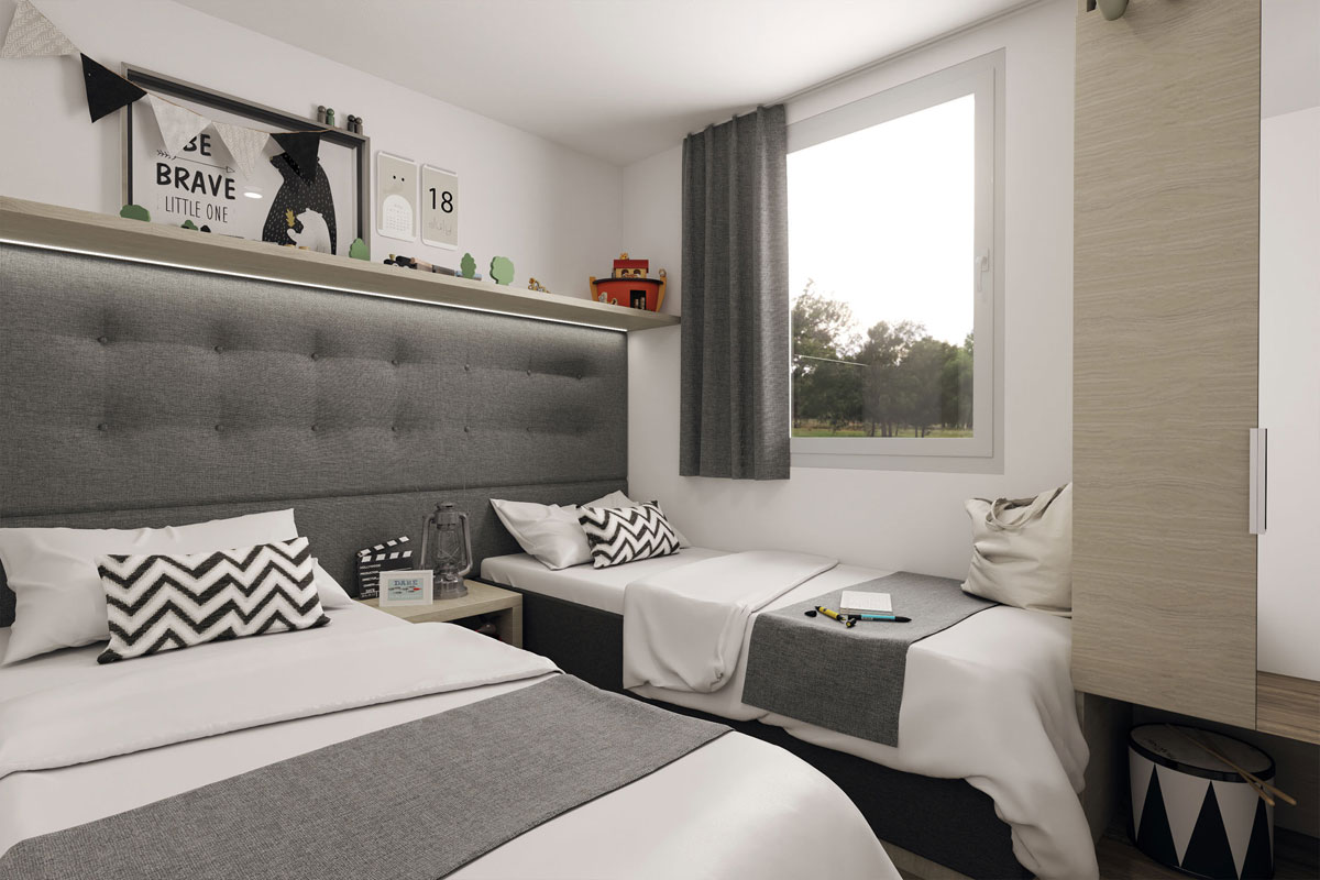 Med sina 8 x 4 meter ryms två sovrum samt en soffa i sällskapsrummet, som ger totalt 4 sovplatser. Sovrum 1 har en stor dubbelsäng med sängbord, hylla och garderob. Sovrum 2 har två enkelsängar, sängbord samt garderob.