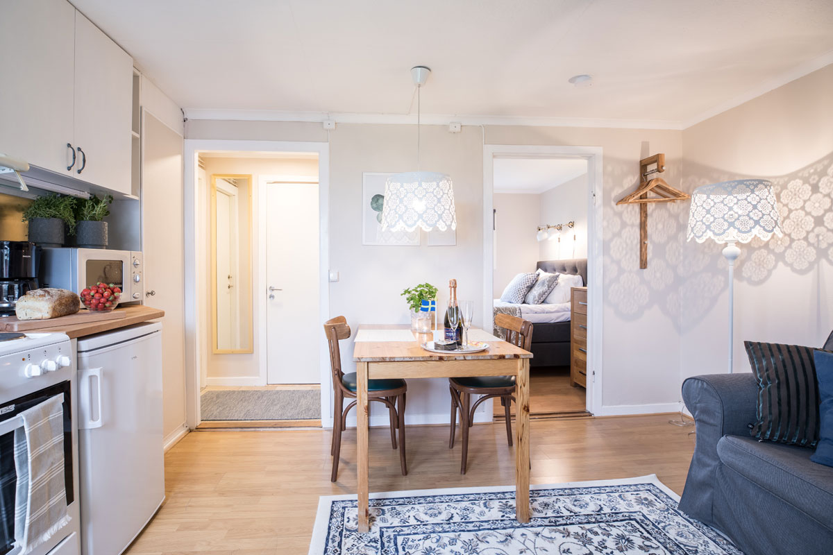 Perfekt för er som vill ha en bekväm vistelse för två. Här finns allt ni behöver i ett fullt utrustat kök, badrum, ett sovrum och ett allrum med soffa och TV. Dessutom har stugan en egen altan med trädgårdsmöbler.