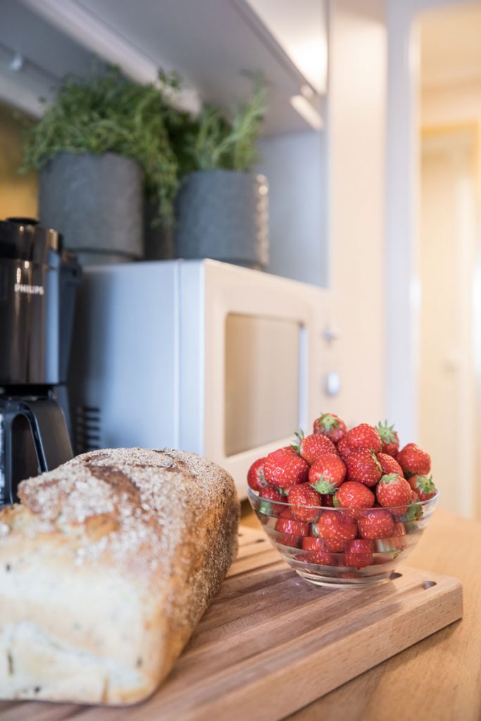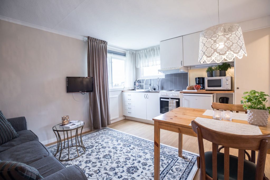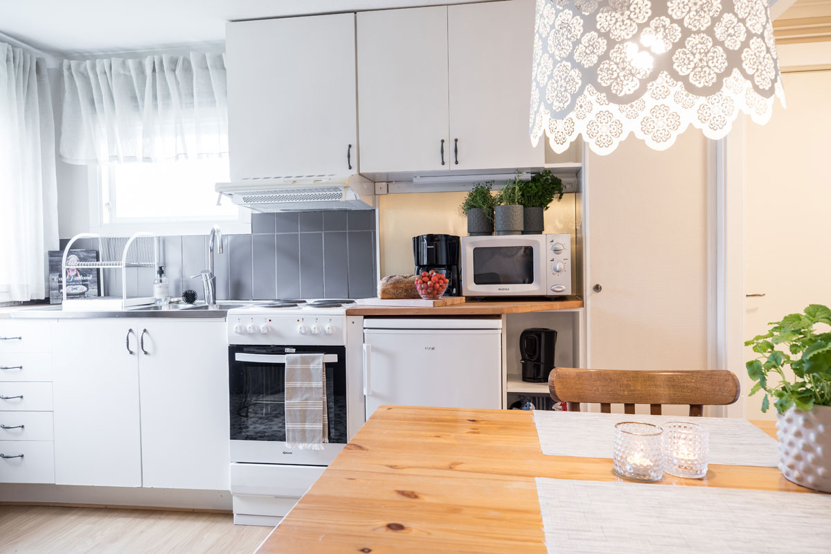 Stekspade, visp, plastslev, konservöppnare, osthyvel, vinöppnare, brödkniv, smörkniv, potatisskalare, sax, grytunderläggx2, gratängform, skärbräda, stekpanna, kastrullx3, salladsskålx2, bricka, durkslag, brödkorg, litermått, vattenkokare, mikrovågsugn, kaffebryggare, dammsugare, moppstativ och mopp, hink, brandvarnare, TV med tillhörande kontroll.