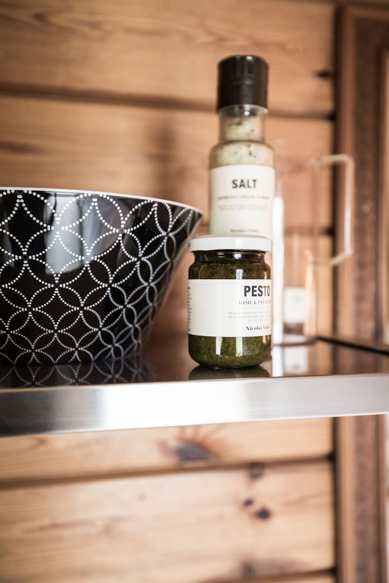Stekspade, visp, plastslev, konservöppnare, osthyvel, vinöppnare, brödkniv, smörkniv, potatisskalare, sax, grytunderlägg, gratängform, skärbräda, stekpanna, kastrull, salladsskål, litermått, vattenkokare, kaffebryggare, dammsugare, moppstativ och mopp, hink, brandvarnare.