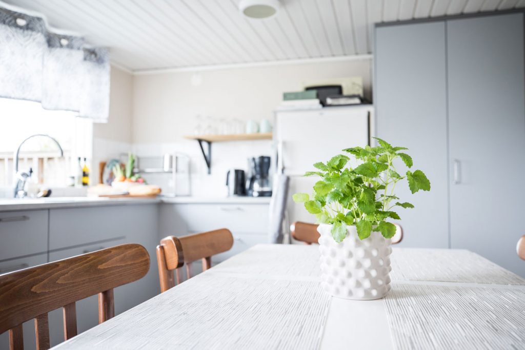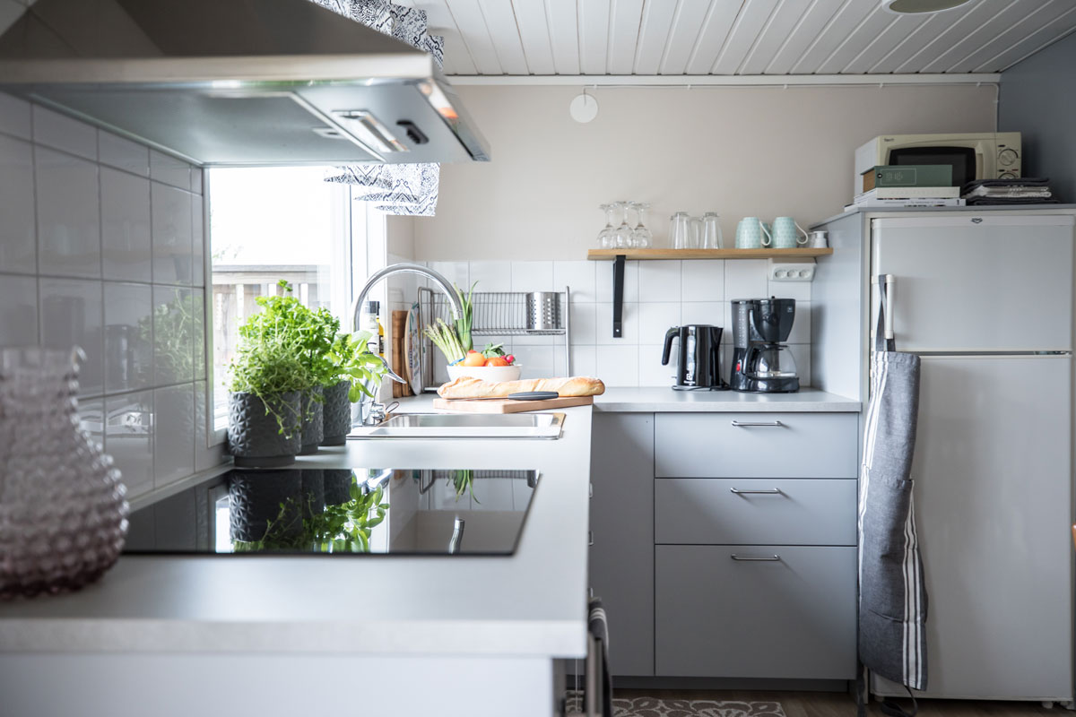 Stekspade, visp, plastslev, konservöppnare, osthyvel, vinöppnare, brödkniv, smörkniv, potatisskalare, sax, grytunderlägg x 2, gratängform, skärbräda, stekpanna, kastrull x 3, salladsskål x 2, bricka, durkslag, brödkorg, litermått, vattenkokare, mikrovågsugn, kaffebryggare, dammsugare, moppstativ och mopp, hink, brandvarnare, TV med tillhörande kontroll.