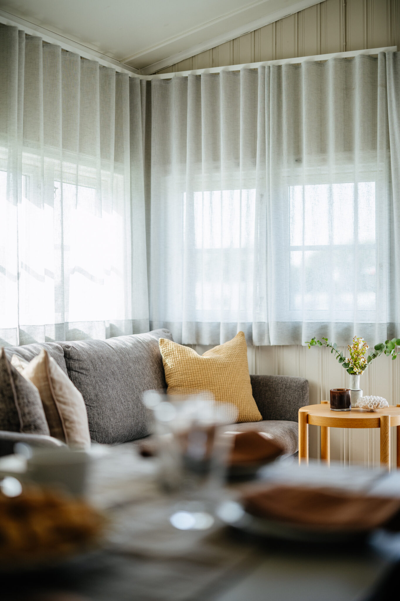 Täcken, kuddar, flata tallrikar, soppskålar, dricksglas, muggar, matskedar, knivar, gafflar, teskedar, äggkoppar och assietter.