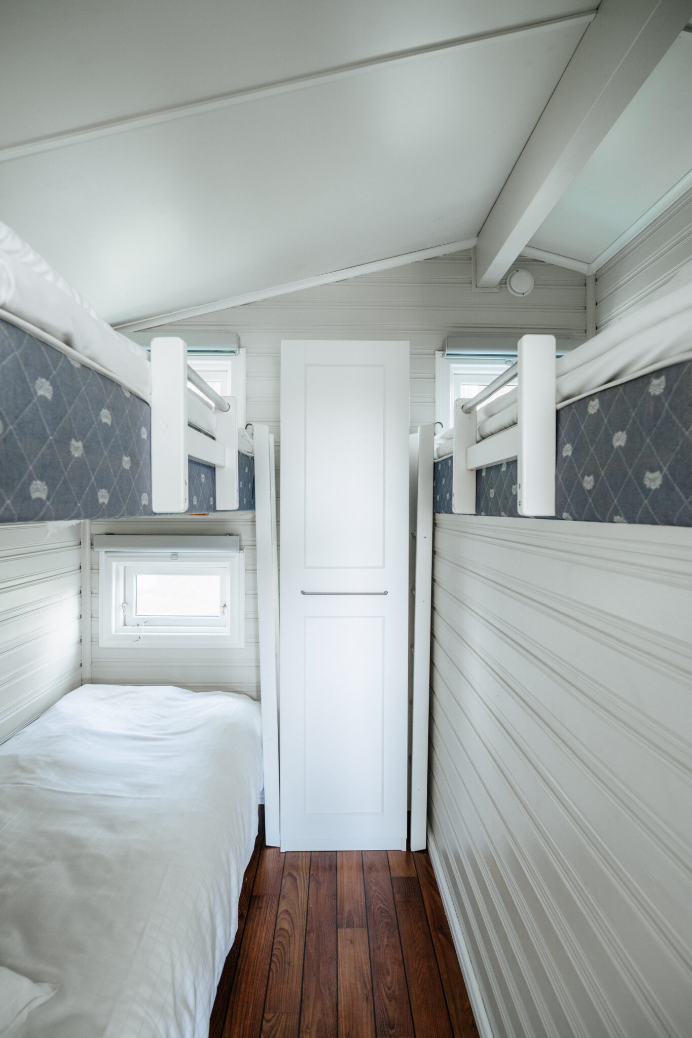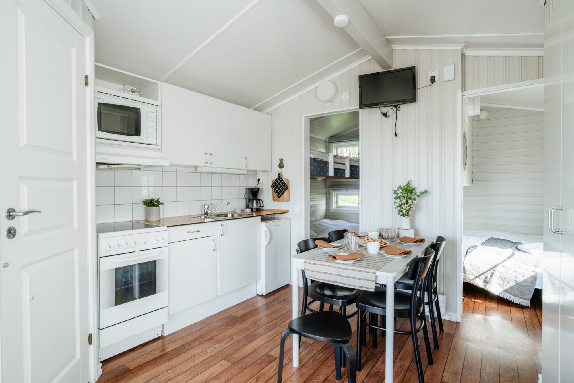 Semester för det stora sällskapet! Dessa stugor har ett fullt utrustat kök, badrum och allrum med TV. Här finns två sovrum, där ett sovrum har en våningsäng och en loftsäng, och ett sovrum med en säng, 140 cm.
