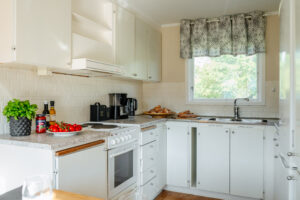 Stekspade, visp, plastslev, konservöppnare, osthyvel, vinöppnare, brödkniv, smörkniv, potatisskalare, sax, grytunderläggx2, gratängform, skärbräda, stekpanna, kastrullx3, salladsskålx2, bricka, durkslag, brödkorg, litermått, vattenkokare, mikrovågsugn, kaffebryggare, dammsugare, moppstativ och mopp, hink, brandvarnare, TV med tillhörande kontroll.